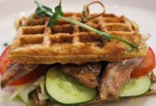 Сырные вафли с беконом, фирменным соусом и яйцом-пашот