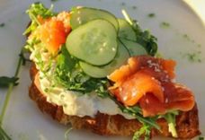 Крофли с лососем, рукколой, фирменным соусом и огурцом