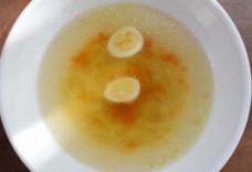 Бульон с перепелиным яйцом, лапшой и булочкой